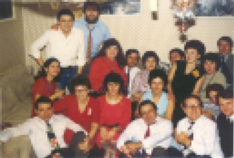 Csávási Gyuri piros nyakkendővel, mögötte Rácz Juli (Kovács) kék ruhában.