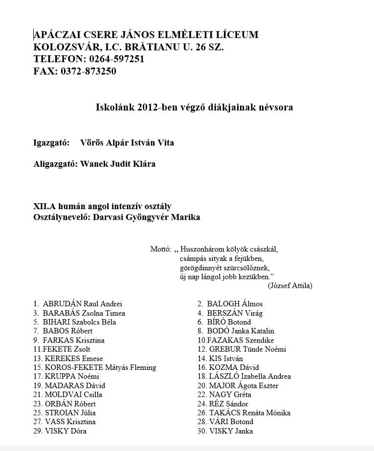 Véndiákok névsora