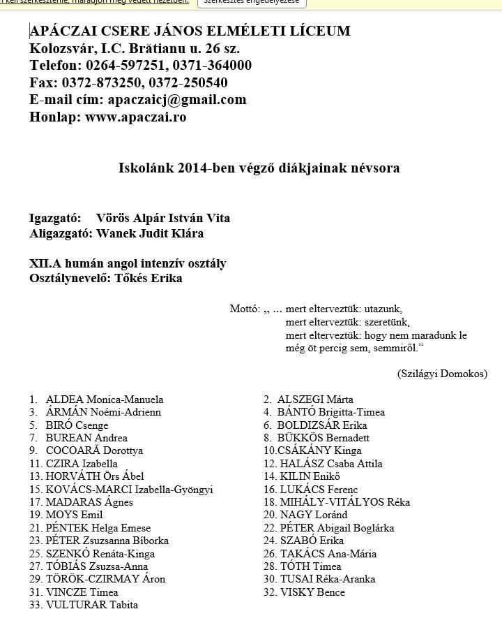 Véndiákok névsora
