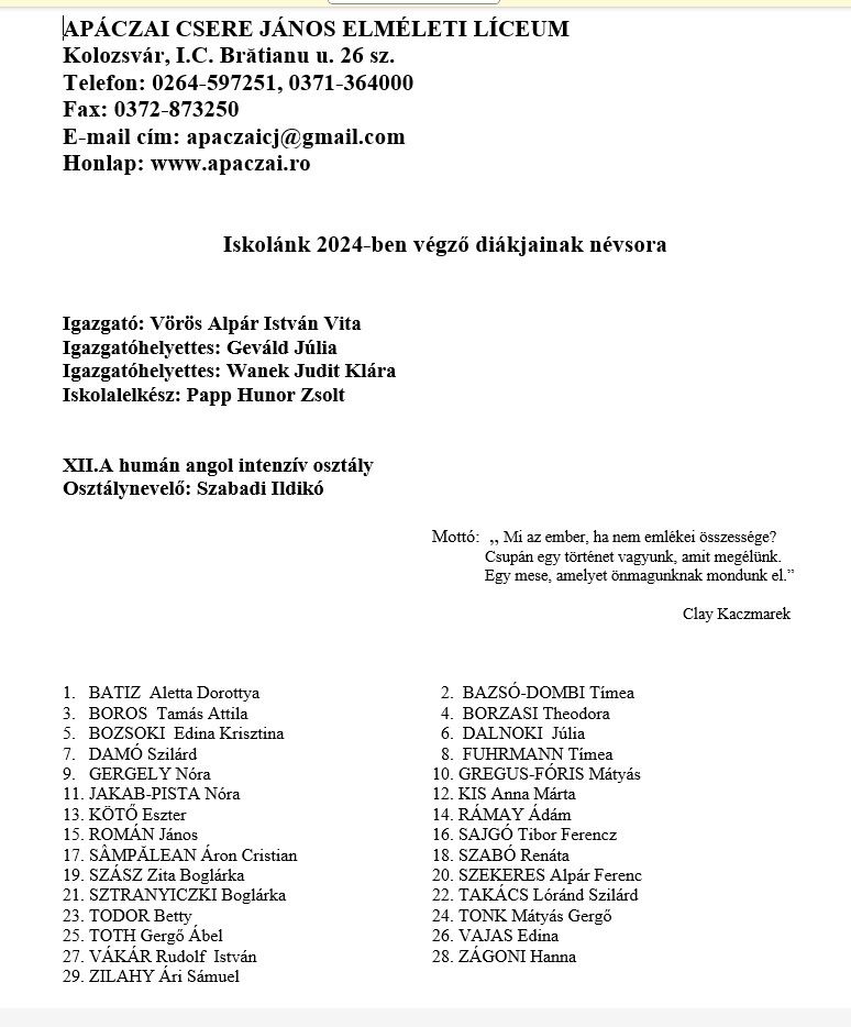 Véndiákok névsora