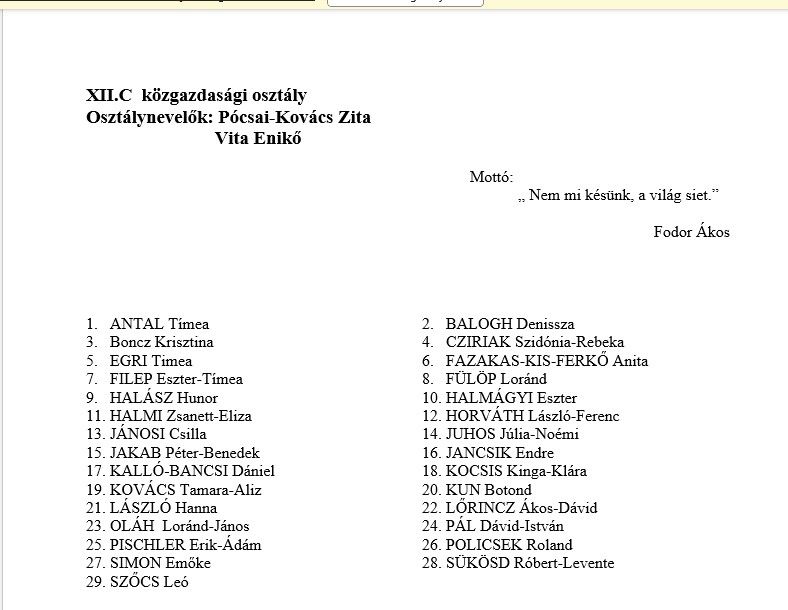 Véndiákok névsora